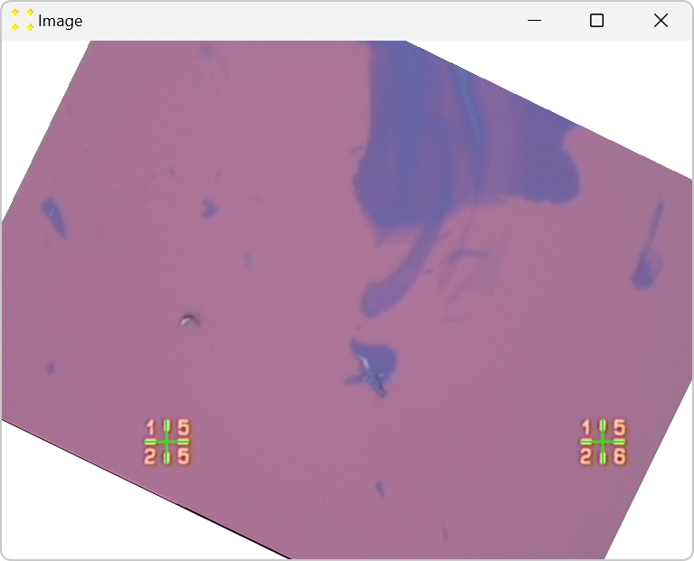 Figure 3. Opened optical image with transformation marks (green marks are used in this example; the color can be changed, as discussed below) placed by SVGMarks. The image shows graphene flakes of different thicknesses (from a monolayer to a thick multilayer). Three gold marks (in yellow), patterned by electron-beam lithography, are also visible. They define the local coordinate system of the image. In this image, the sample is deliberately rotated counter-clockwise by about 26 degrees to demonstrate the capabilities of SVGMarks. In reality, the axes of the local coordinate system should be as parallel as possible to the edges of the image (i.e., the line connecting the two lowest patterned marks should be as parallel as possible to the horizontal edge of the image).